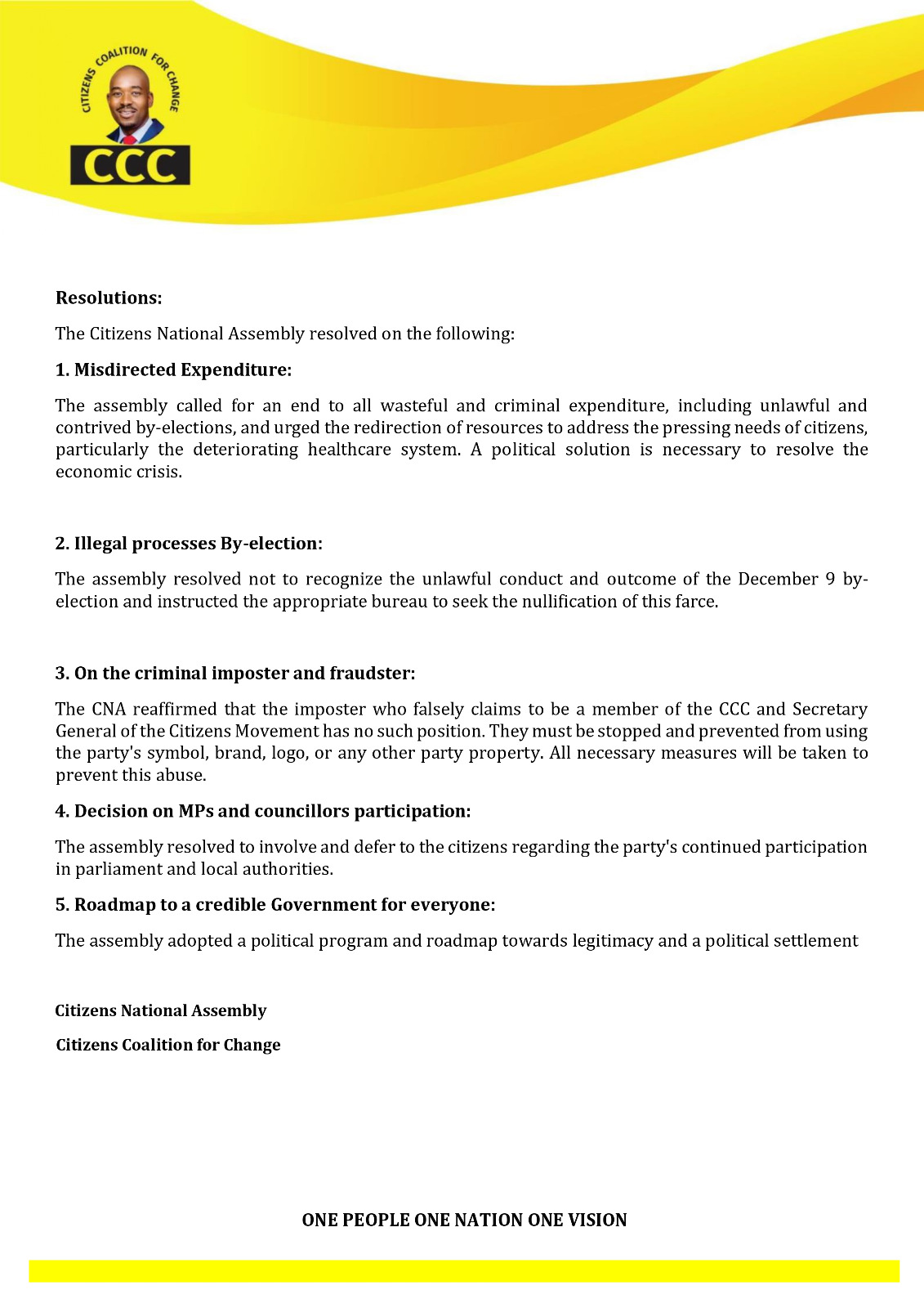 ""The original CCC idea has however been contaminated, bastardized, hijacked by ZANU PF through the abuse of State institutions. CCC has not been aligned to its founding Purpose and Mandate. Further, CCC has now been rendered an extension of and been taken over by ZANU PF. CCC has, to all intents and purposes, been criminally handed over to ZANU PF.""
